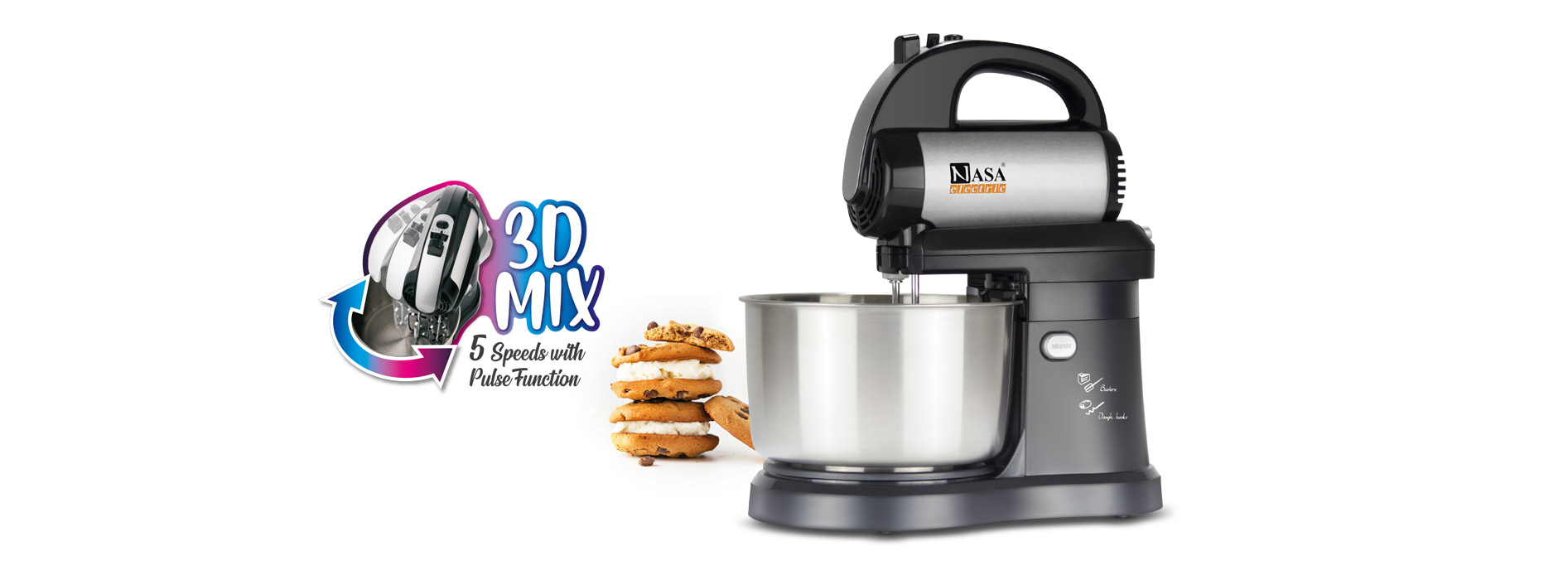 همزن کاسه دار ناسا الکتریک NS-932 یک همزن حرفهای برای تهیه انواع کیک و شیرینی و ورز دادن خمیر و … میباشد. این همزن هم بصورت کاسه دار و هم بصورت تکی وبدون کاسه استفاده میشود، که همین موضوع کارآیی دستگاه را بسیار بالا برده است. موتور قدرتمندی که برای این همزن تعریف شده است، دارای توان مصرفی حداکثر 400 وات بوده و از قابلیت تنظیم سرعت نیز بهره میبرد. تنظیمات سرعت از طریق دکمه تعبیه شده بر بالای دسته صورت میگیرد، که میتوان از طریق آن سرعت را در 5 سطح مختلف تنظیم نمود. همچنین عملکرد توربو TURBO از دیگر قابلیتهای همزن به شمار میرود، که از حداکثر سرعت و قدرت موتور برای هم زدن مواد داخل کاسه بهره میبرد. در واقع در این همزن از قابلیت چرخش سه بعدی اتوماتیک بهره گرفته شده، که به هم زدن بهتر و سریعتر مواد داخل کاسه کمک میکند.